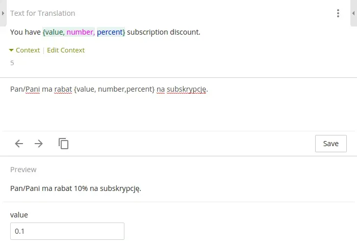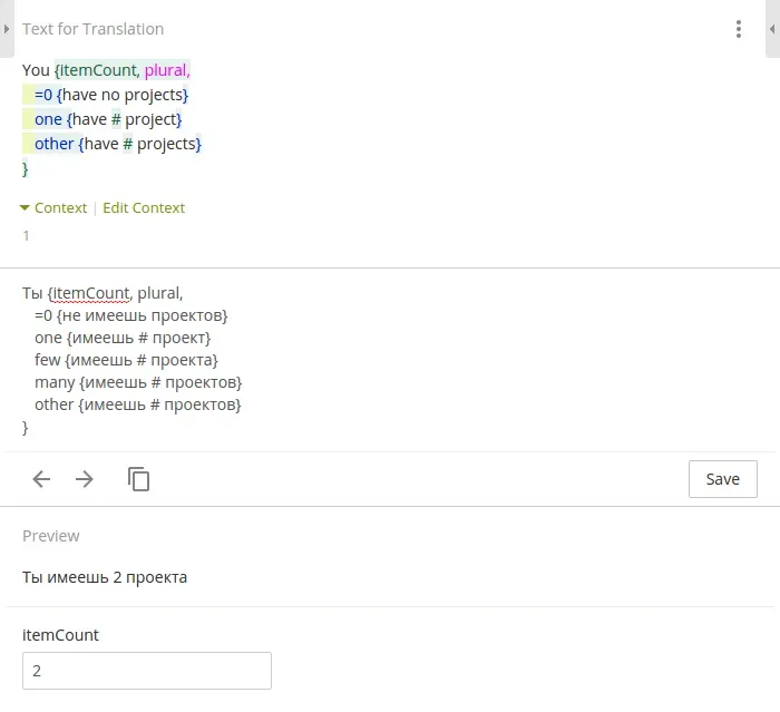 Crowdin recognizes ICU formats and with a help of really handy Pre-view option makes it possible to observe different variations. Syntax is also highlighted so it is very convenient to keep required areas within the sight and manage translations swiftly!